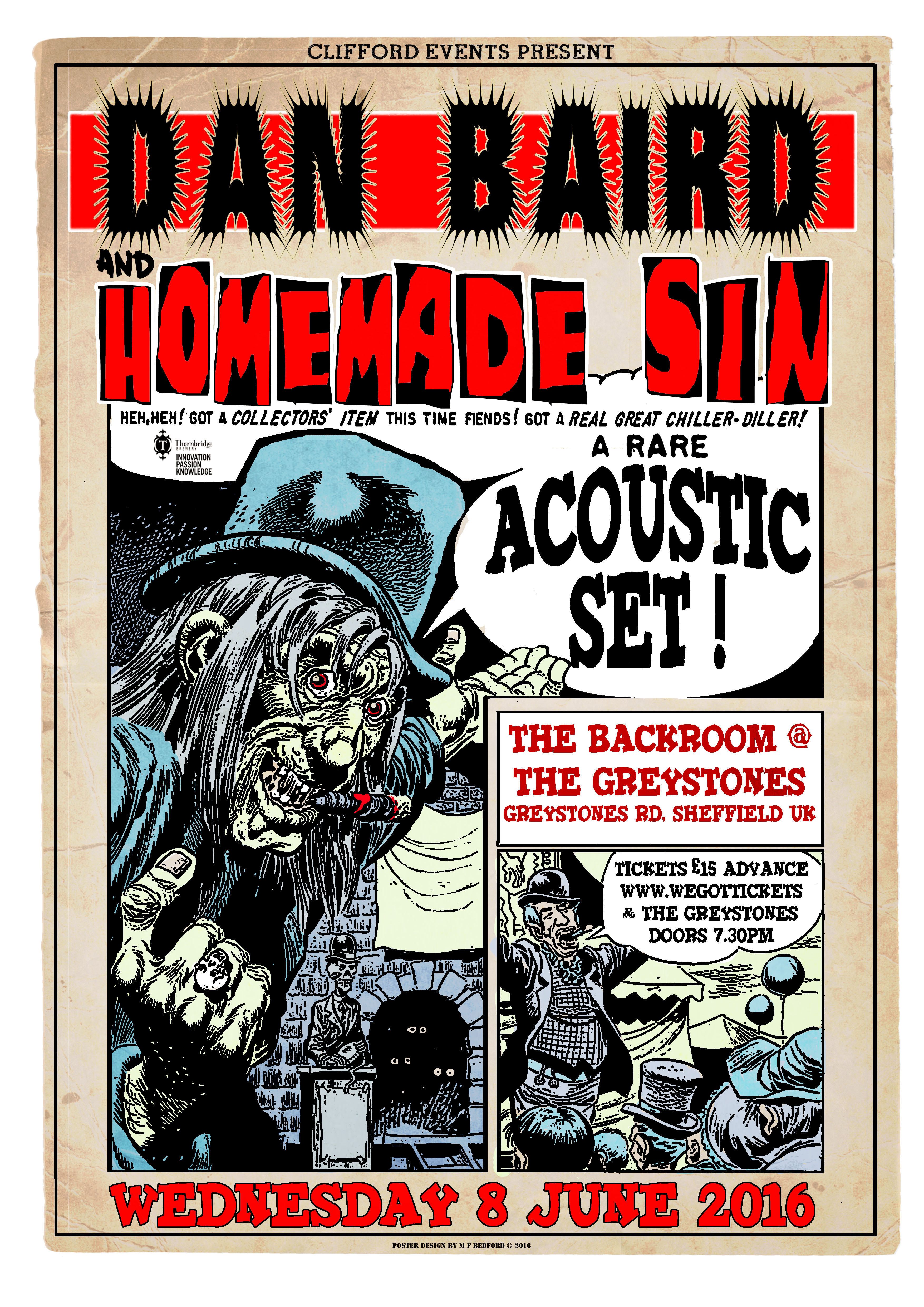 Promotional gig poster for Dan Baird the Homemade Sin. A rare acoustic set. Playing at The Greystones music venue. Sheffield. June 2016.