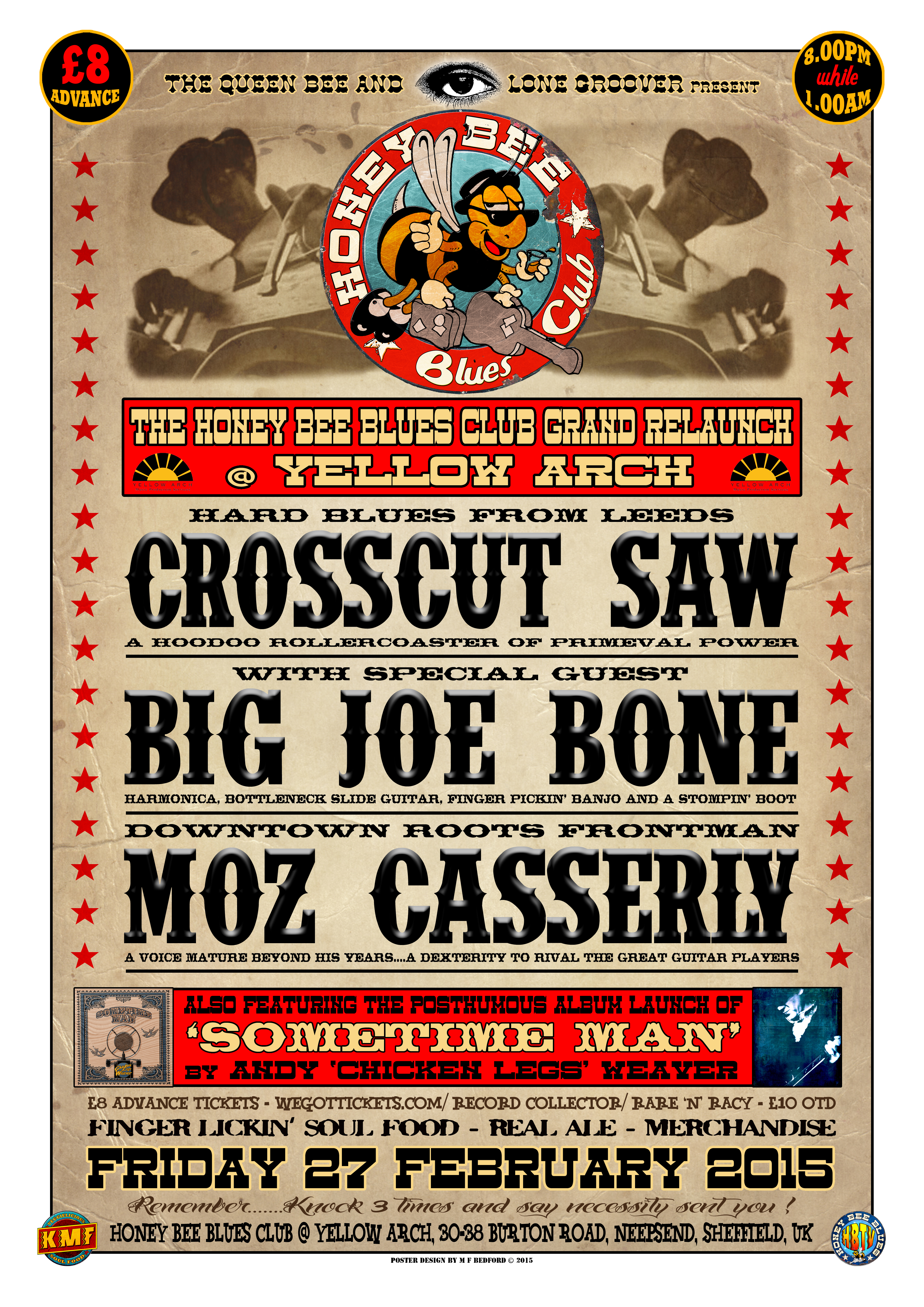Promotional gig poster for Crosscut Saw. Supported by Big Joe Bone and Moz Casserly.